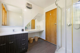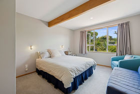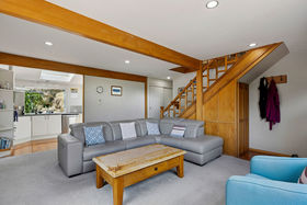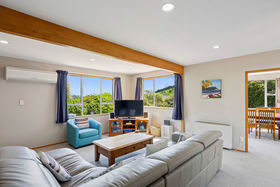 The driveway leads directly to the double garage with internal access. Inside, the modern kitchen has been designed for real use - functional, streamlined, and brightened by a skylight that fills the space with natural light. From here, the living room sits at the centre of the home, complete with a heat pump, and connects naturally to the sunny dining room. This level also includes a double bedroom and the family bathroom.